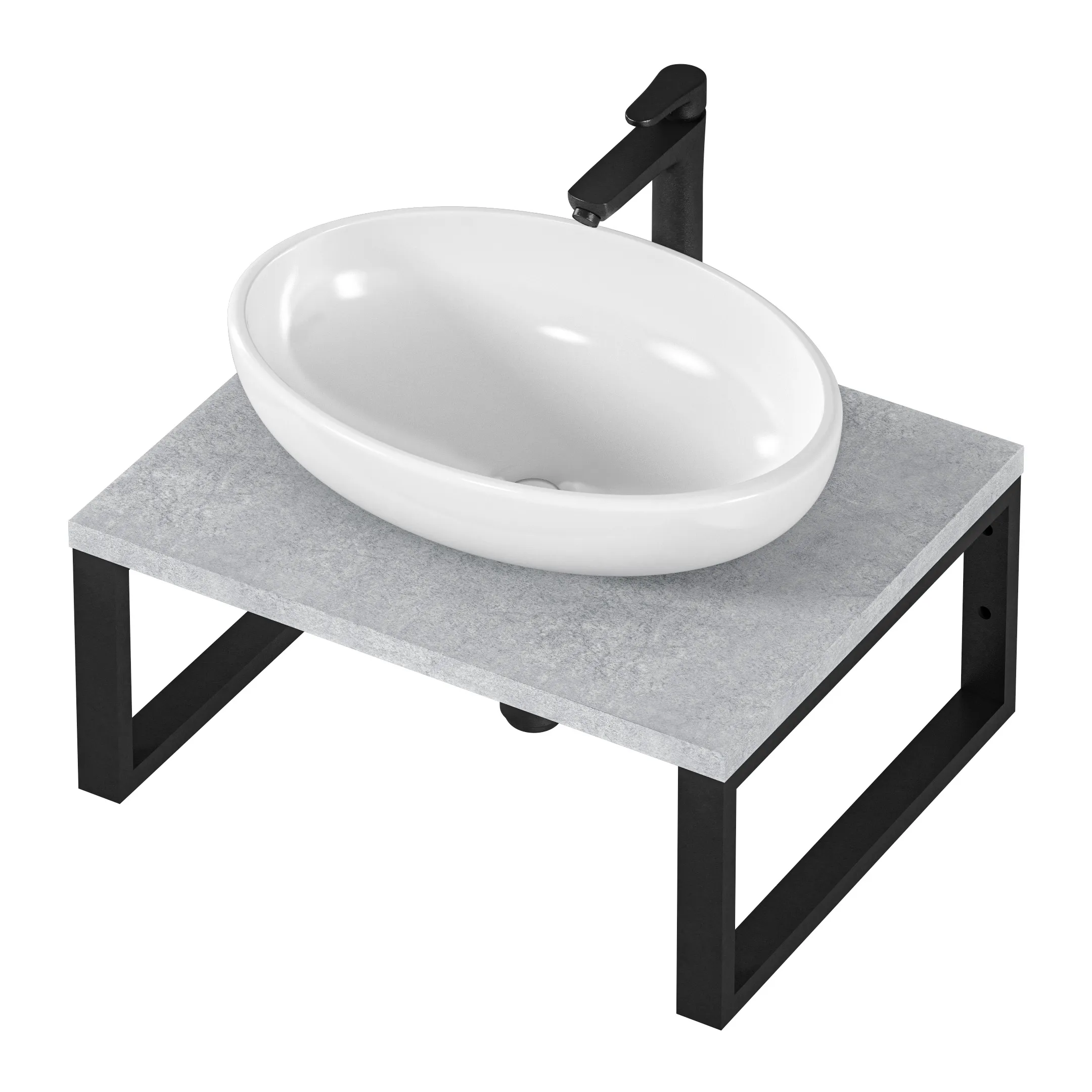 Подвесная столешница под раковину в ванную в стиле лофт – нестандартное компактное решение для современного интерьера. Сочетание оттенка светло-серого бетона и металла вносит эффект новизны в привычный дизайн ванной комнаты.Характеристики: