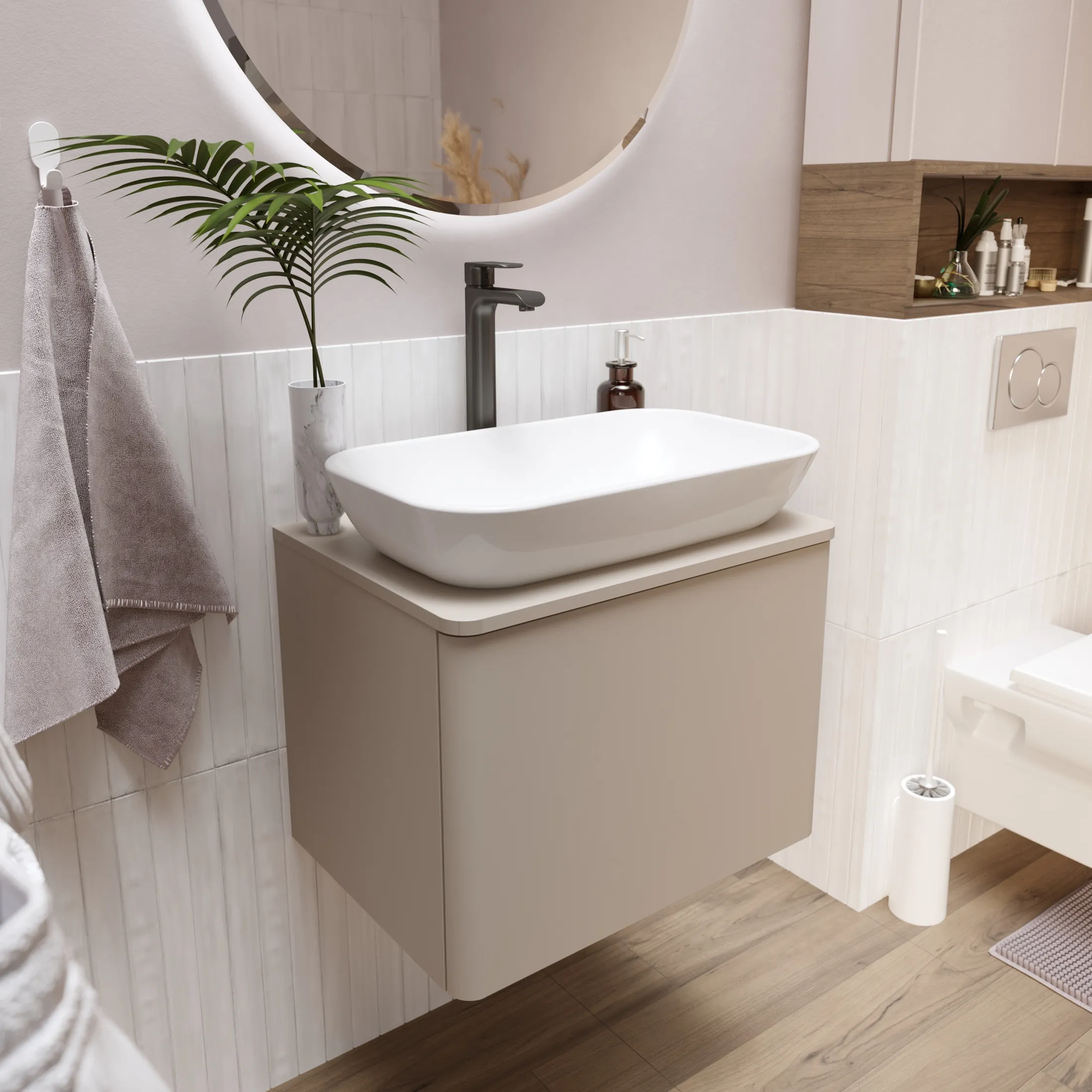 Подвесная тумба Wish — ультраминималистичная модель для ванной комнаты. Каждая линия тумбы продуманы до мелочей и воплощают в себе элегантность и практичность. Теплый оттенок капучино, округленные края придают тумбе особый почерк, создавая ненавязчивую расслабляющую атмосферу.Характеристики: