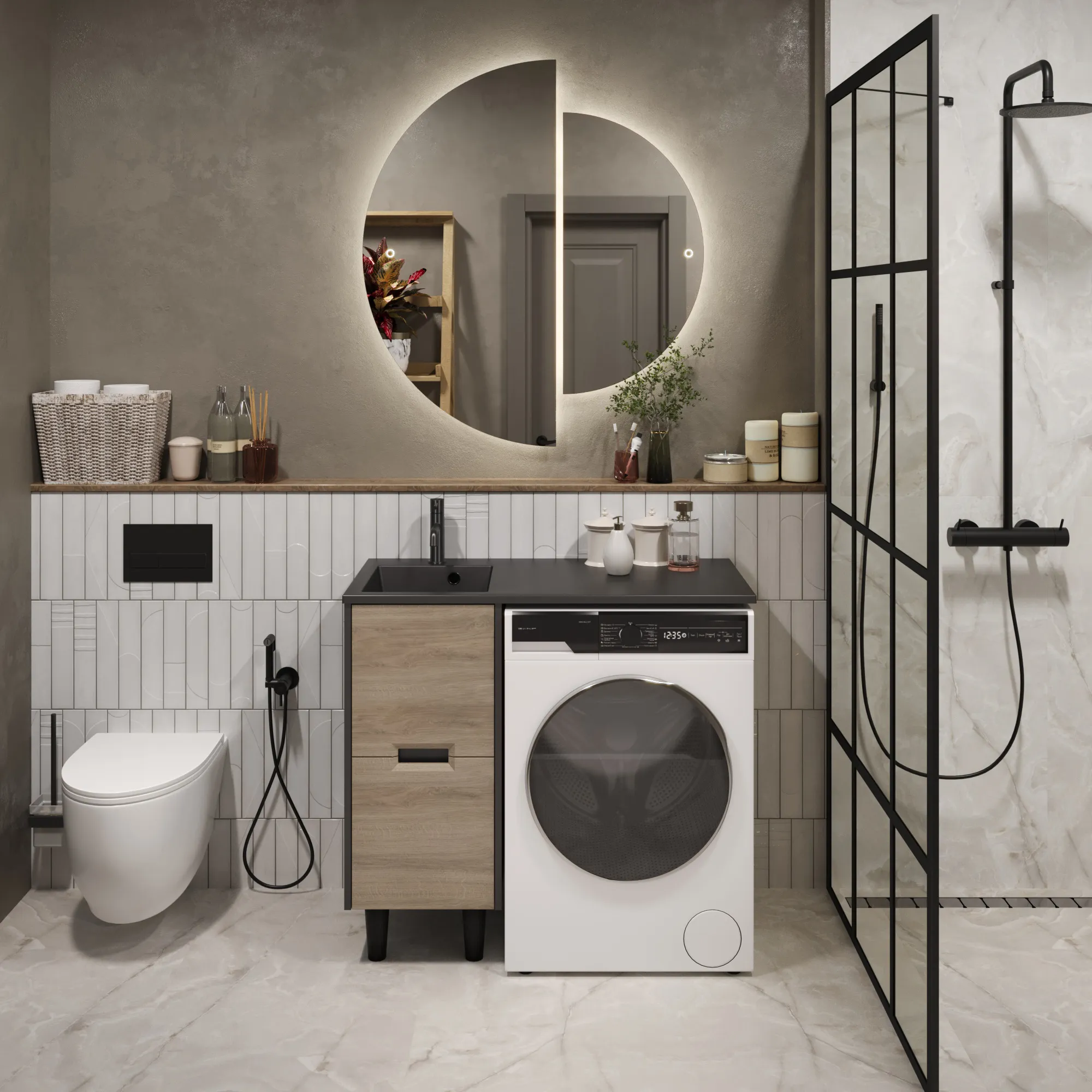 умба под раковину* и стиральную машину Maid – элегантное и функциональное решение, она создает гармоничное пространство в ванной комнате. Искусное сочетание антрацита и "ореха лучистого европейского" придает тумбе изысканный вид, а два вместительных ящика помогут легко организовать порядок. Акцентные опоры черного цвета гармонично дополнят ваш выбор: строгая графитовая или нежная белая раковина – для создания неповторимого стиля ванной комнаты.Характеристики: