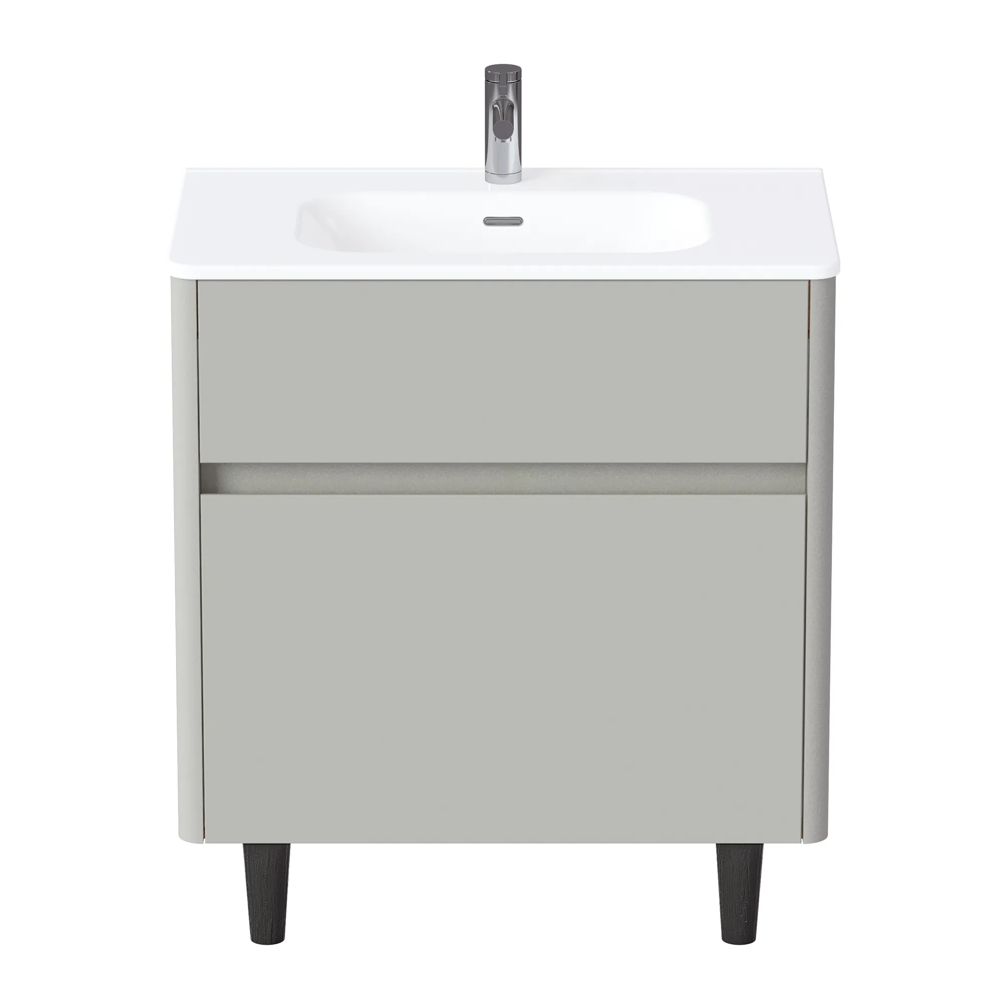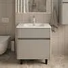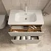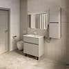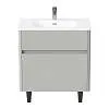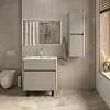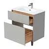 Матовый фасад, интегрированные ручки, керамическая раковина* с широкими бортами для хранения и полки в тон теплому дереву придают интерьеру изящность и подчеркивают характер. Трендовый серый цвет освежает интерьер, делая современным и мягким, а тумбу подходящей для большинства интерьеров ванной комнаты.