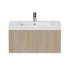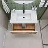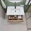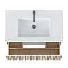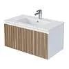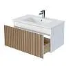 Тумба под раковину* Row - утонченная роскошь в ванной комнате. Белоснежный корпус и фасад из МДФ, покрытые матовой итальянской эмалью, создают благородный и элегантный вид. Декоративные рейки из шпона на фасаде добавляют уникальную текстуру и глубину, делая тумбу арт-объектом. Один вместительный ящик с плавными доводчиками гарантирует комфортное использование, хранение необходимых ванных принадлежностей, а подвесная конструкция визуально расширяет пространство и облегчает уборку.Характеристики: