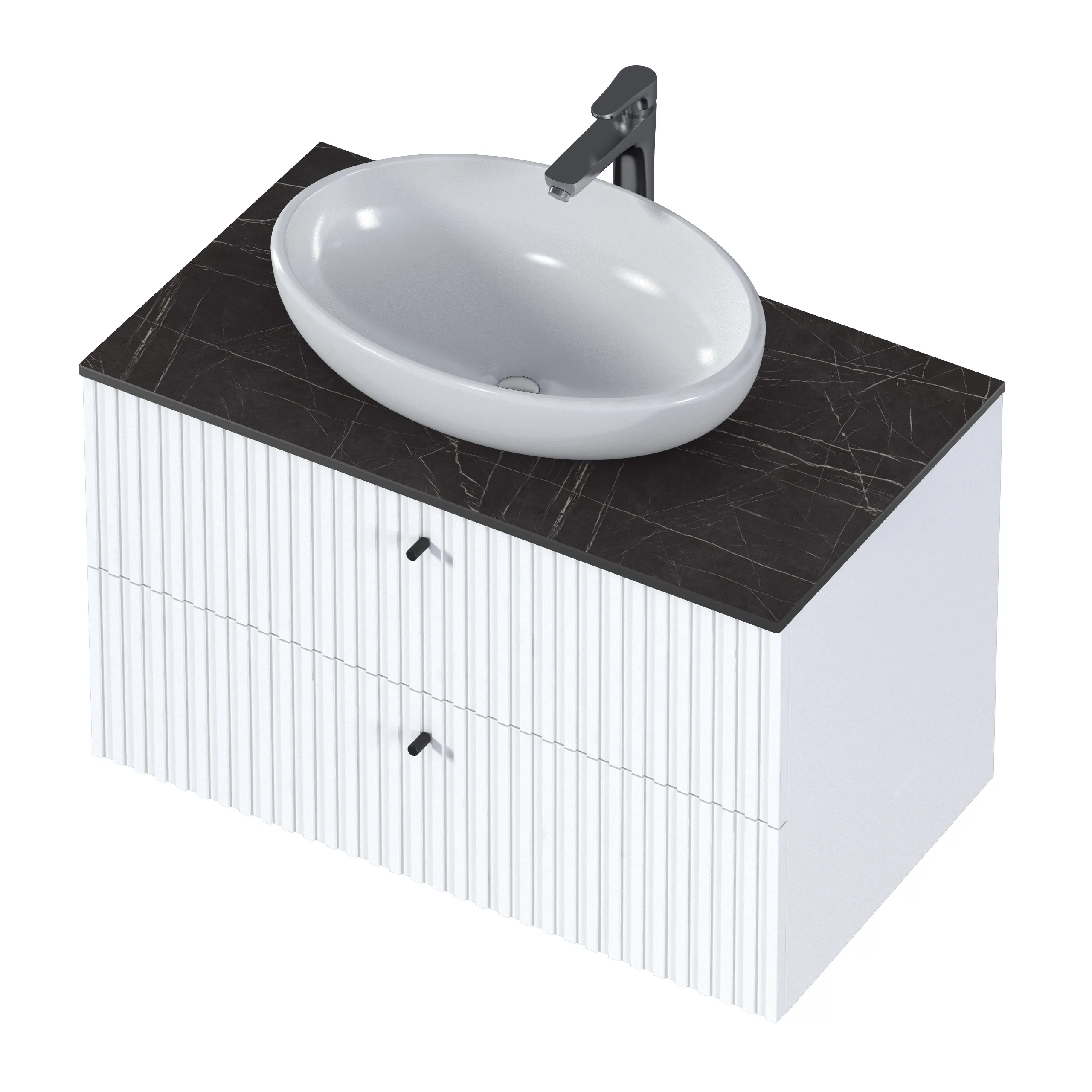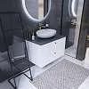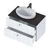 • Контрастное сочетание цветов: белый корпус и черная столешница создают стильный и современный образ, который привлекает внимание и подчеркивает индивидуальность интерьера ванной комнаты.