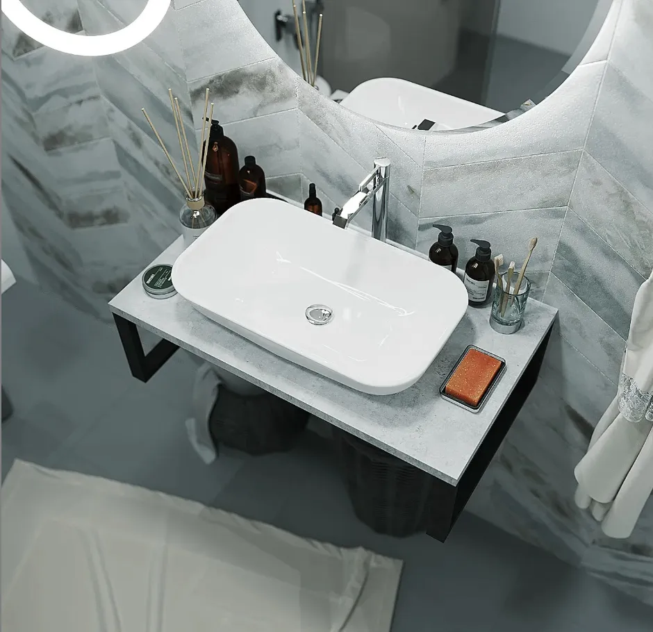Функциональная и стильная столешница в востребованной и актуальной стилистике LOFT. Минималистичная и одновременно эффектная, она изготовлена в универсальной прямоугольной форме и дополнена такими практичными деталями, как металлические кронштейны, которые можно использовать в качестве рейлингов. Столешница выполнена из проверенных материалов, прекрасно защищена от воздействия влаги, не склонна к появлению сколов, царапин, трещин и других дефектов. Она подойдет для ванных комнат любых размеров и практически любой цветовой гаммы - от сдержанной до яркой и насыщенной.Характеристики: