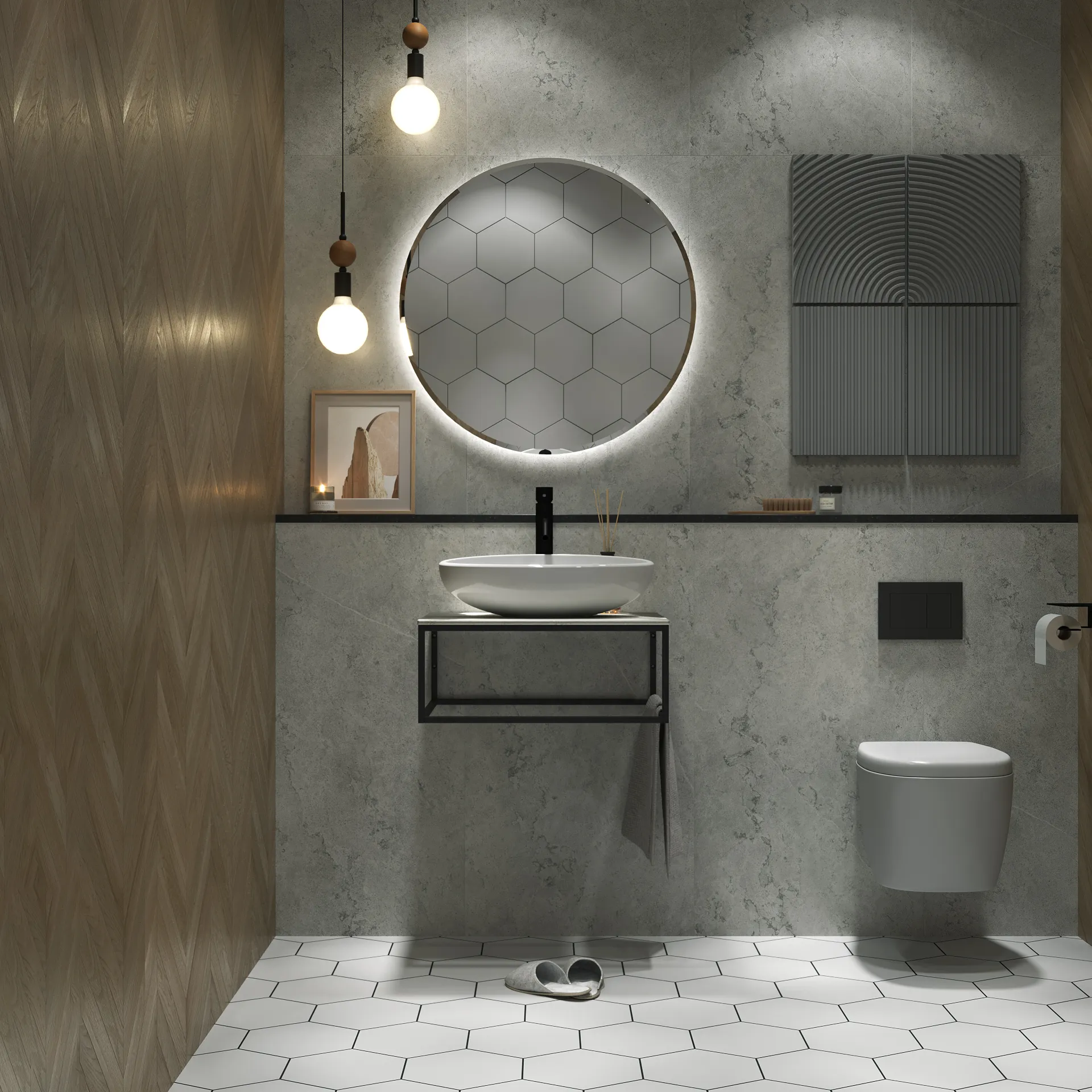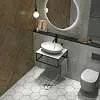 Столешница из керамогранита - это стильное, функциональное и долговечное решение, которое подойдет для ванных комнат, исполненных в самых разнообразных отделочных материалах. Такая универсальность, тем не менее, предполагает высокую декоративную и эстетическую ценность столешницы - она делает обстановку в ванной комнате по-настоящему стильной и соответствующей актуальным тенденциям в дизайне. Металлическое подстолье создает эффектный цветовой контраст, а также может использоваться в качестве практичных рейлингов для удобного размещения полотенец и банных халатов.Характеристики: