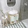 • Материал фасада – МДФ, облицованная матовой пленкой ПВХ, светлый деревянный корпус из влагостойкой ЛДСП. Благодаря этому тумба надолго сохранит первозданный вид в условиях повышенной влажности ванной комнаты.